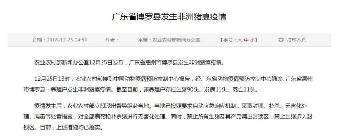 农业农村部新闻办公室12月25日发布,广东省惠州市博罗县发生非洲猪瘟疫情。